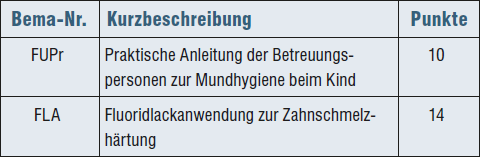 Die Leistungen sind zeitlich mit den U-Untersuchungen beim Kinderarzt abgestimmt. Die Eltern sollen von den Kinderärzten ab der U5 (Untersuchung zwischen dem 6. und 7. Lebensmonat) über das Angebot der zahnärztlichen Früherkennungsuntersuchungen informiert werden. Durch diese ergänzenden Bema-Leistungen wurden gute Voraussetzungen zu einer besseren Zahngesundheit, auch für die kleinsten Patienten der GKV, geschaffen.